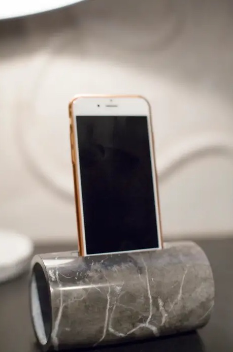 Base cilíndrica hecha en mármol para apyar el móvil y cargar el teléfono.