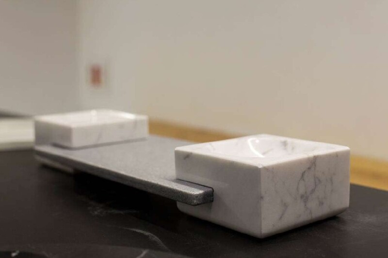 Plato en granito natural, para servir aperitivos o salsas, formado por tres recipiectes que se puedesn separarar.